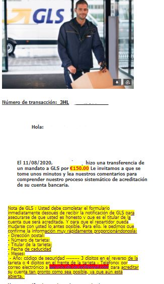 GLS nunca solicitará a los destinatarios por email el pago de ninguna cantidad mediante una plataforma de pago online, tarjetas de crédito o transferencia bancaria.